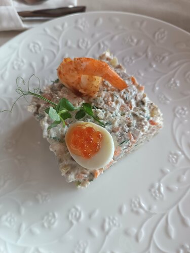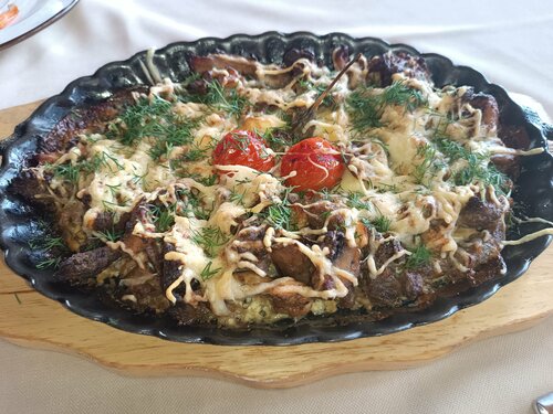 Задолго до поездки в Гагру тщательно проштудировала все отзывы про "Гагрипш". Негатив был с перевесом 50+ процентов. Решила для себя, что не хочу рисковать деньгами и настроением, просто сфотографируемся на лестнице и все. Муж уговорил)) ПОСЛЕ посещения и всего, что я начиталась про "Гагрипш" ДО, у меня разрыв шаблона. На входе вежливые доброжелательные хостес. Спокойно рассказали про условия и депозиты. Наш официант был позитивный, с юмором. Подходил без задержек. Да и другие тоже, за которыми понаблюдала, подходили к гостям с улыбками. Блюда отдавались очень быстро. По кухне из того, что мы заказывали, придраться обьективно было не к чему. Ну, может, в лодочке тесто было в одном месте чуть-чуть непропеченое, но это не точно)) Зато салат "Оливье по рецепту 1875 года" был с идеальной нарезкой. Равномерной, пропорциональной и мелкой. Именно как я дома всегда готовлю. И много-много мяса в нём вместо классического перекоса в сторону более дешёвых картофеля и яиц. Респект повару! "Оливье" получился вот как дома для себя. Место атмосферное. Видовое. Фото получились шикарные. Ну, и плюс, реально очень вкусно поели и хорошо провели время за обедом в приятном месте с историей.
