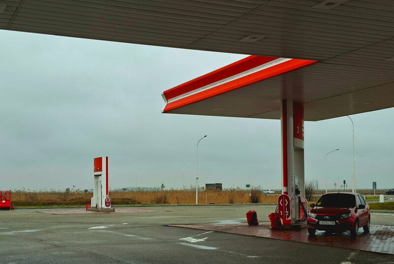 Хорошая заправка, большой ассортимент товаров и еды. Есть туалет внутри здания.