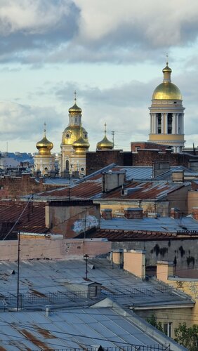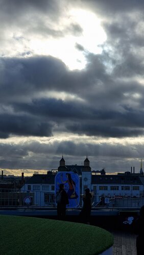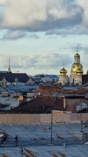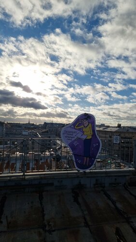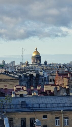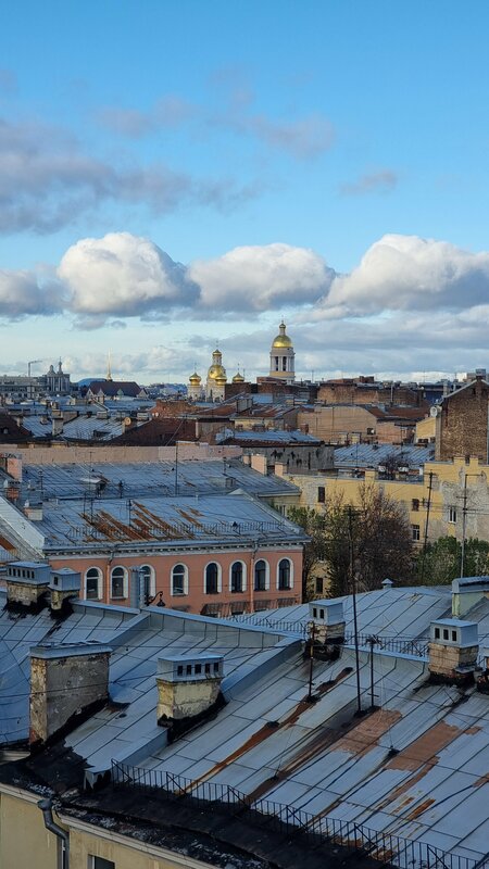 Потрясающий вид во все стороны, очень большая площадка. Сейчас там еще забавная выставка комиксов про Питер с классическими фразочками. Еа крыше можно спокойно час провести, разглядывая окрестности со всех сторон. И прямо на выходе на неё барчик с глинтвейнами)