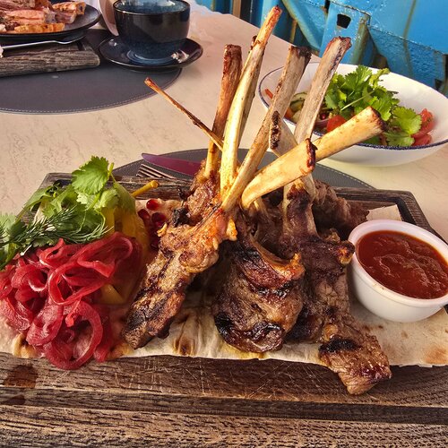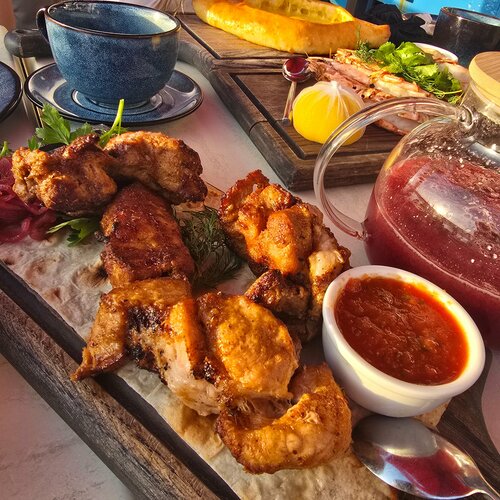 Посещали этот рай шедевральной кухни в ноябре 2025 года. Все под впечатлением от кухни, все очень вкусно! Шашлык таящий во рту, оставляя послевкусие сочной, ароматной, прожаренной на углях свинины. Креветки на углях , как поцелуй моря. А о маринованном луке только и вспоминать....... Подача и вид блюд, все очень красиво и манко.