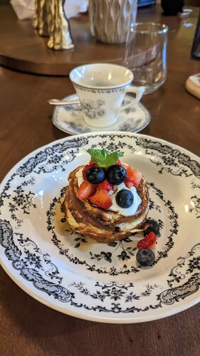Очень красивое, атмосферное заведение! Официанты вежливые. Взяла панкейки из пп меню, ооочень нежные, сладкие, но не приторно. Американо нормальный. Думаю, приду ещё, попробовать пиццу