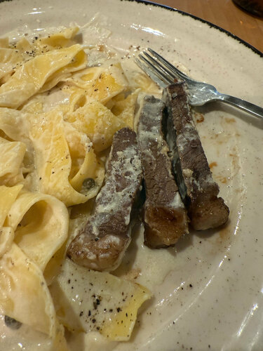 Заказала папарделе со стейком пиканья, с фото конечно можно обойтись без комментарий. НО. Сам стейк как кусок чего то сухого, едва жующегося. Официант не уточнила даже всё ли понравилось.