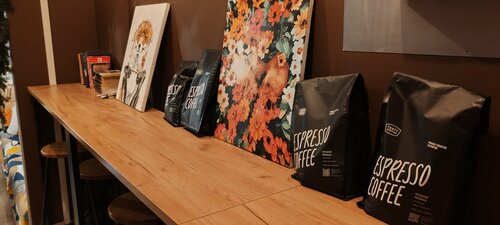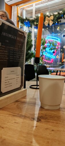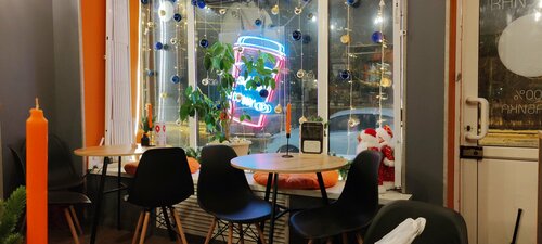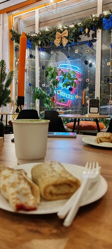 Уютное, яркое кафе с очаровательной сотрудницей. С таким теплым отношением к посетителям все кажется вкуснее и настроение лучше. Хороший выбор напитков, перекусить можно блинчиками, сырниками или выбрать не/традиционные кондитерские изделия. Это кофетерий формата зайти выпить чашечку кофе или прихватить с собой. Полноценного меню тут нет. Напитки подаются в бумажных стаканчиках и в ходу одноразовая посуда, возможно ваш внутренний эстет запротестует. Мы заглянули вечером, ближе к закрытию и все вкусняшки были съедены до нас, но мы нашли чем себя угостить.