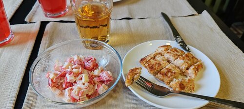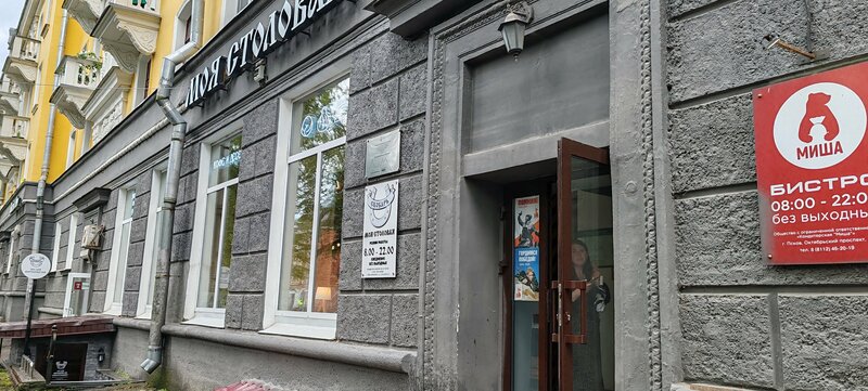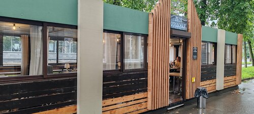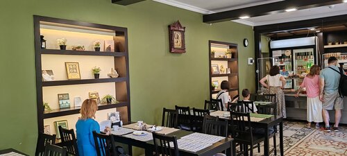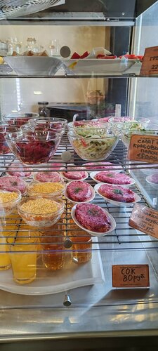 Хорошое место для отдыха всей семьей. Работает по принципу столовой: берете поднос, выбираете еду, платите, относите на стол, оплата на кассе. После еды, стол убирает официант. Атмосфера уютная, больше похоже на кафе, очень удобные стулья, приятное обслуживание, можно брать на вынос, есть замороженная продукция: пельмени и пр. Есть кондиционер. Работает уличная веранда. В июле народу было немного. Выбор еды большой, голодными вы не уйдете. Котлеты, мясо по французски, куринные сердечки, супы, блины, компоты нам понравились. Отдельно продаются десерты и кофе. Я брала десерт павлова: крем был творожный и очень много сахара. Кофе мне понравился.