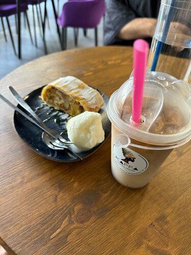 Место уютное, есть два столика снаружи и около 6 внутри, вкусные десерты, крепкий и ароматный кофе. Зашли с супругом среди недели, место проходное, в глаза бросается, взяли айс латте - понравился даже без сиропа, и штрудель яблочный с мороженым, тоже неплохой. В наличии были сырники, блинчики, сендвичи. Звезду сняла только за отношение персонала ко мне, я всегда здороваюсь и доброжелательно настроена, а тут в ответ я ничего не получила, сделала заказ, его молча оформила девушка, а доброжелательно сделала кофе и после попрощалась только бариста. Однако со всеми входящими мужчинами обе девушки активно здоровались и улыбались. Вряд ли вернусь сюда снова, не смотря на уютную атмосферу