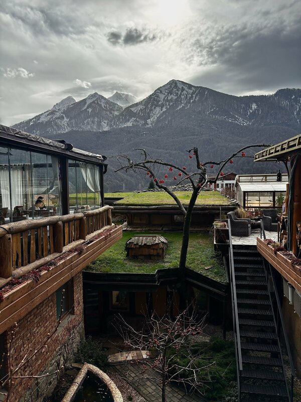 Прикольное место с панорамным видом на горы, где можно выпить глинтвейна, съесть теплый пирог и отдохнуть после катания! Зимой это место оживает 😎