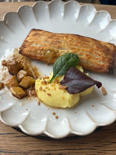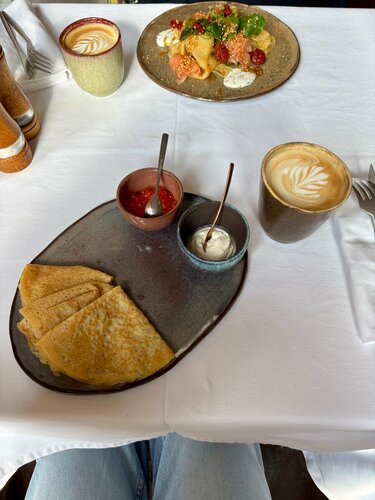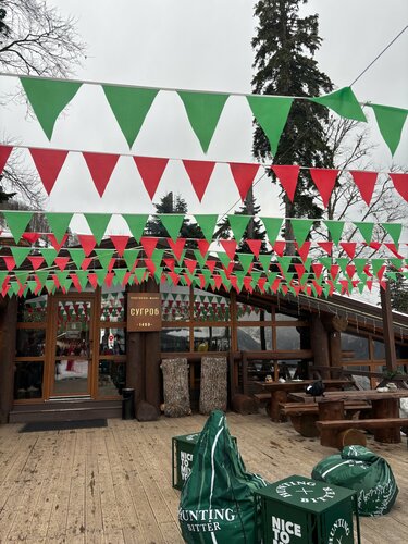 Очень уютный ресторан на Красной Поляне, к сожалению, тут всегда аншлаг и столы надо бронировать заранее, особенно в солнечную погоду! Мы попали на меню завтраков в Масленичную неделю и поэтому попробовали только блинчики. На 2м этаже заглянули в магазин сувениров и одежды (в основном банной) и тоже полюбовались видами из окна! Обязательно приедем еще раз и попробуем основное меню!