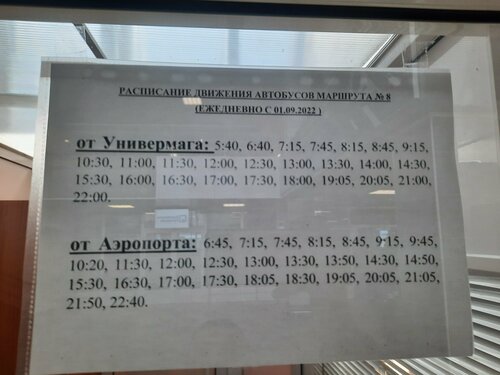 В аэропорту чисто. Режим работы с 5:00 до 17:00. У меня была долгая пересадка. Я не привередливый, поэтому мог бы и в аэропорту подождать, но из-за режима работы пришлось искать место для ночлега. Сразу скажу, что цены, которые указаны в объявлении об аренде квартиры на сутки не соответствуют действительности. Все гораздо дороже. Для тех кто курит скажу, что после прохождения досмотра перед полётом, комнаты для курения не предусмотрено. Места в зале ожидания не много, но в тоже время не толпились. Есть различные кафе на 2 этаже, а также автоматы с кофе. Также прикрепил фото с расписанием автобуса №8, который едет в город и обратно. Расписание ак уально на май 2023 года