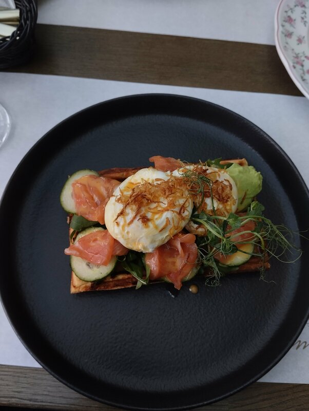 Прекрасное заведение, очень красиво, музыка невероятная, еда супер, особенно грибной суп очень понравился, десерты от самой кофейни, персонал очень милый, уютная кофейня советую на фото сырные вафли с слабосолёным лососем