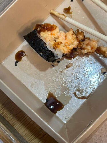 Второй раз заказали доставку и пожалели! В первый раз роллы приехали все слипшиеся в один большой шар, корн доги приехали не с сосиской, а просто с сыром, ТАК ЕЩЕ И С ДОШИРАКОМ( пс у нас с подругой брекеты). Мы решили дать второй шанс и второй раз разочаровались. Суши приехали горелые с привкусом гари. Корн дог выглядел не то что неаппетитно, его не полили соусом, сыра вообще не чувствуется, обычная сосиска в панировке. Ток поки, точнее соус испачкал все, начиная с пакета. Боул болеее менее хороший. Мы разочарованы, приехало холодным;((