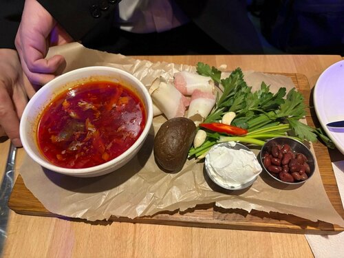Был на корпоративном мероприятии. > Программа слабенькая, что видно хотя бы по тому, что никто из посетителей особо вовлечен в действо ведущего не был. Этот самый ведущий видно, что старался. Хотя с другой стороны, а как иначе, нужно создать хотя бы видимость бурной активности. Конкурсы - просто испанский стыд! Спасибо ведущему, что не включил в программу танец утят! > Музыкальная программа не новогодняя, не праздничная. Кавер-группа "Wake up" исполняла тоже самое, что она исполняет в "Амбере" и в обычные свои трудовые будни. Пение исполнителя было слышно плохо, так что пришлось подойти к нему и просить добавить звука в части вокала. > Два парня-охранника напрягали не одного меня своим видом. Охрана точно не должна выглядеть как представители неблагополучной дворовой среды. > Работа гардероба - это катастрофа! Висят тремпели, на которых написаны номерки. Номерки нанизаны на проволочку отдельно. Задача усложняется тем, что все тремпели развешаны вперемешку. Гардеробщик снимает номерок и начинает пересматривать все тремпели в поисках совпадений. Очень долго!!! > Но самое катастрофичное - это кухня. Она съедобна, но не более того! Салат с камамбером - это несколько кусочков камамбера в панировке, рваный мандарин , пара кусков огурца и много-много зеленого салата! Свиной шашлык - жесткий и какой-то застывший. Сложилось ощущение, что он был не очень свеж. Соусница на блюде с мясом снаружи была тоже в соусе. На сковородке все компоненты были склеены между собой и сковородкой. Картошка, которая входила в состав этого блюда - вареная! Том ям худший, который я пробовал в своей жизни! Это борщ со сливками, в который добавили две половинки черри, две креветки и две мидии. Все сдобрено петрушкой. Вкус - отвратительный! Паста - это просто позор! Это не паста а обычные отварные спагетти, которые принесли склеенными между собой. Этот монолит можно было нарезать и есть кусками. Борщ с уткой - понравился. Все блюда, о которых идет речь - фото прилагаются.