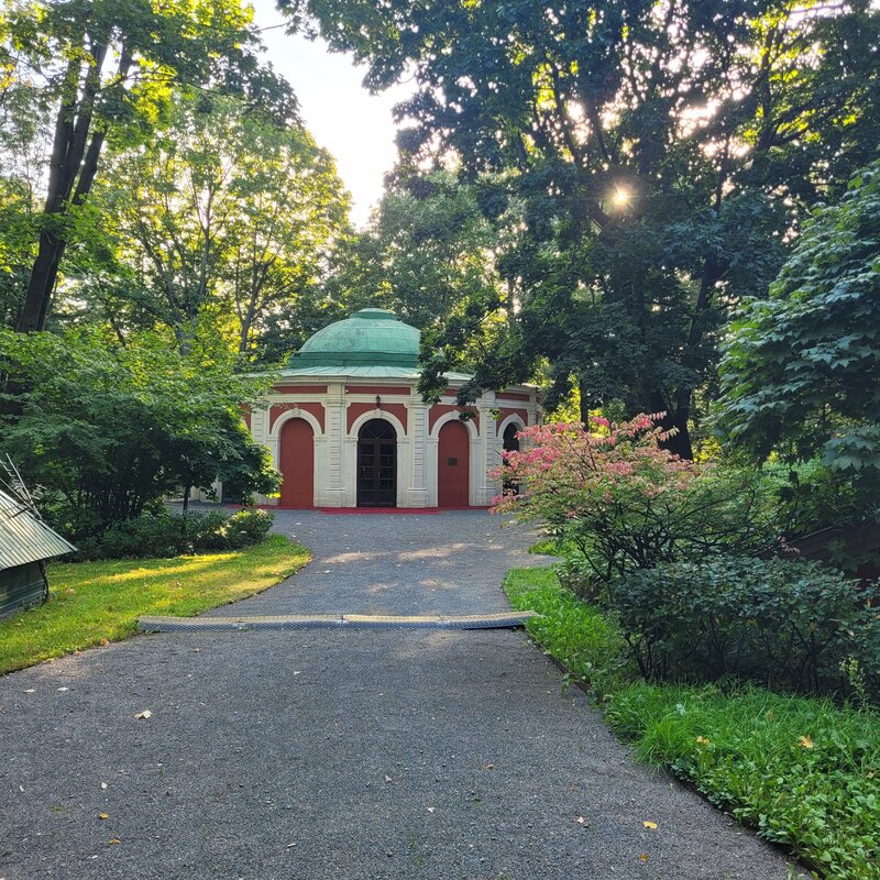 Сейчас к Охотничьему домику нет возможности подойти близко и рассмотреть, он огорожен. Фото сделано на удаления сетчатого ограждения. Предполагаю, что также, как и многие объекты находится на реставрации.