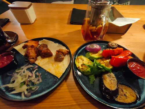 Гуляя по Владимиру, зашли пообедать в данное кафе. Интерьер необычный, создаёт приятную атмосферу✅ Меню разнообразное, заказали на двоих: борщ, тыквенный суп, пасту, шашлык из свинины, овощи гриль и чай "Глинтвейн". Все заказанные блюда очень понравились, подача достаточно быстрая, порции немаленькие(на фото часть шашлыка уже съедена😁). Чек на двоих составил 2300 рублей, что вполне приемлемо, цена соответствует качеству💯 Обслуживание вежливое и внимательное, с удовольствием оставили чаевые🙂 Рекомендую данное заведение и желаю процветания этому кафе!🙏 Обязательно придём снова, когда будем во Владимире ❤️