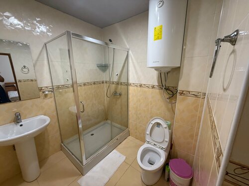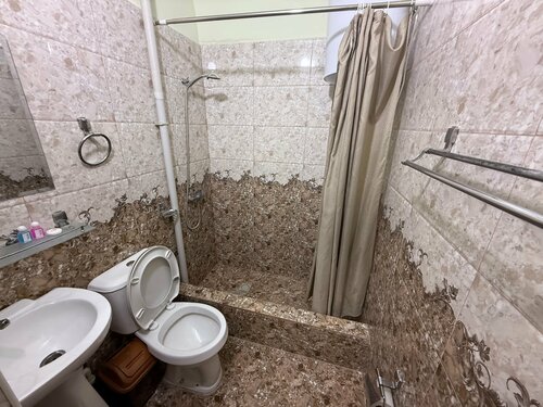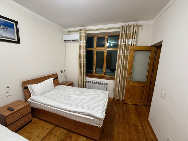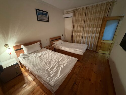 Ехали из Оша в Каракуль. Оказалось, что в Каракуле всё занято, надо искать что-то по пути. Случайно наткнулись на этот отель. На одну ночь супер за такие деньги. Номер для двоих с общей ванной комнатой — 1200 сом. Завтрак отдельно, рядом кафе. В номере есть кондиционер. Wi-fi 7/10. Туалетная комната чистая, вода тёплая есть. Перед отелем небольшая парковка.