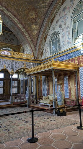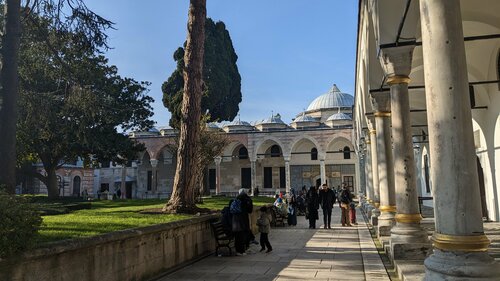 Очень большой дворцовый комплекс, обошли его часа за 4. Билет стоит 2000 турецких лир для одного взрослого (6600₽), что очень дорого. В билет входит осмотр всего комплекса с гаремом + церковь святой Ирины. По отдельности оплатить не дали, только всё целиком. При покупке билета аудиогид бесплатно на русском, но в залог надо оставить паспорт. В аудиогид вводятся цифры с номером объекта и можно слушать. Далеко не ко всем объектам есть аудиозаписи, к сожалению. Помещения, в которых раньше жили, сейчас пустые, либо переоборудованные под музейные комнаты со стеллажами и экспонатами под стеклом. Поэтому походите по пустым залам, увидите голые стены, полы, иногда диваны. Тем не менее интересное и красивое место. На территории дворца есть бесплатный туалет. Очереди на вход и в кассы были маленькие, до 5 минут стояли (понедельник). Кассы работают до 17:00, посещать комплект можно до 18