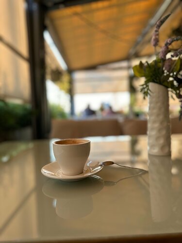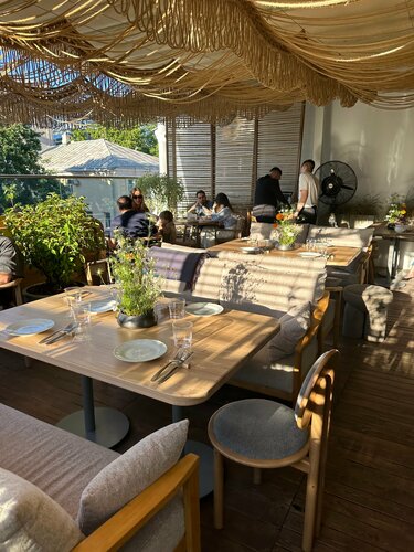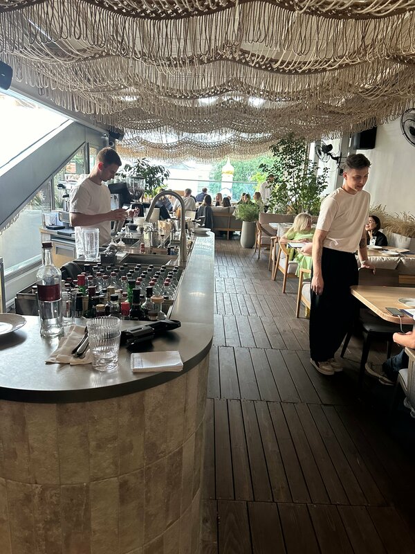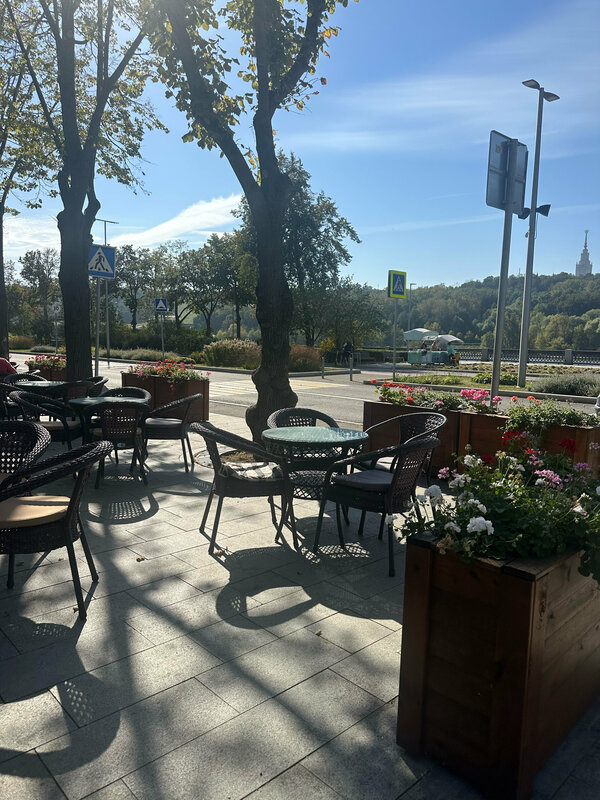 Прекрасное место на свежем воздухе , в хорошую погоду , рядом с проезжей частью, есть парковка, рядом детская площадка ( прямо за рестораном) вид на на Москву -реку и на проезжающие машины, велосипедистов , роллеров , официанты всегда вежливые и быстро обслуживают на столиках всегда есть цветы , удобные кресла и столики, отдалены друг от друга , что приятно . Внутри очень красиво , для более важных событий ( празднование день рождения , просто обеды с семьей и т д ) есть два туалета ( всегда очередь туда , это минус) , ну мы же знаем что идеально не бывает нигде , еда вкусная , средние порции , оплату принимают по карте, наличными, по Q коду Периодически там бываю , пока впечатление моё ничем не испорчено